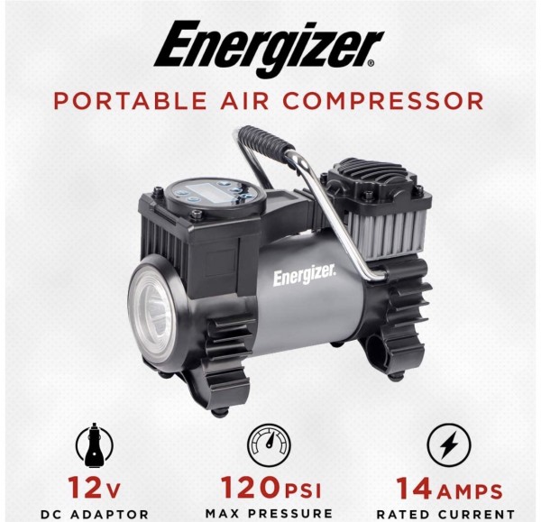Energizer POWERFUL CYLINDER FOR RAPID INFLATION, AUTOMATICALLY SHUTS OFF ONCE DESIRED PRE SET AIR PRESSURE IS REACHED. PLUG INTO VEHICLE'S 12 V OUTLET LCD DISPLAY. INCLUDES : AIR HOSE, 12V DC ADAPTOR, INFLATOR NOZZLE, SPORTS NEEDLE AND CARRYING BAG